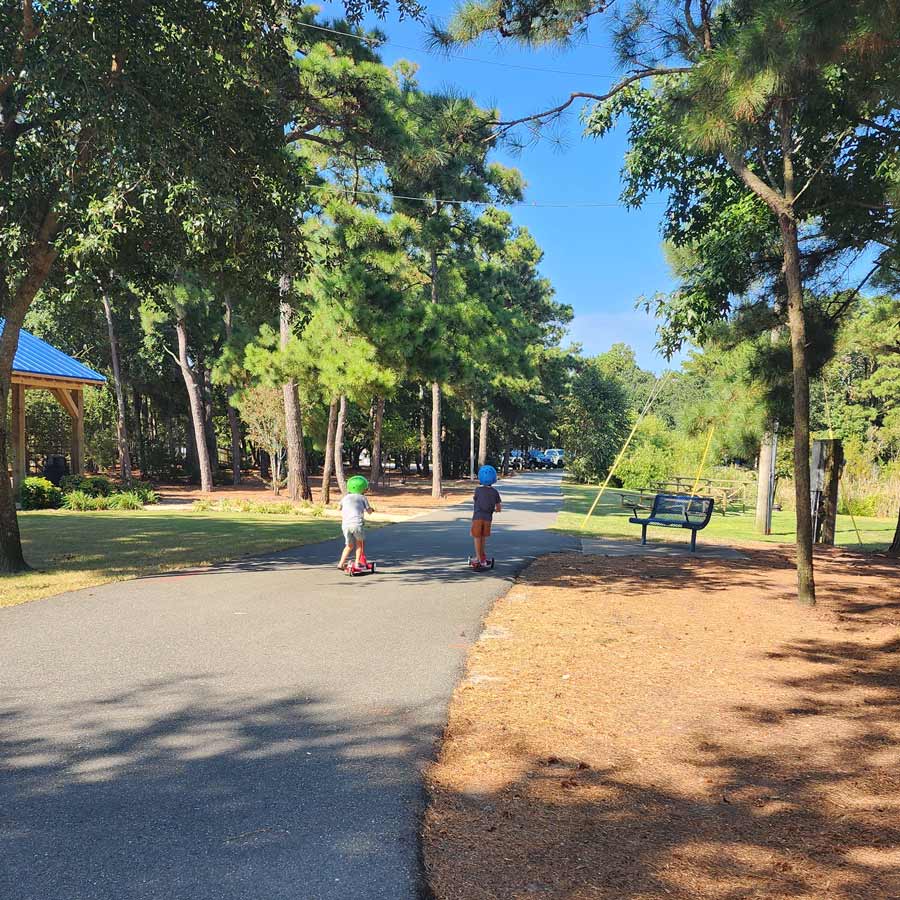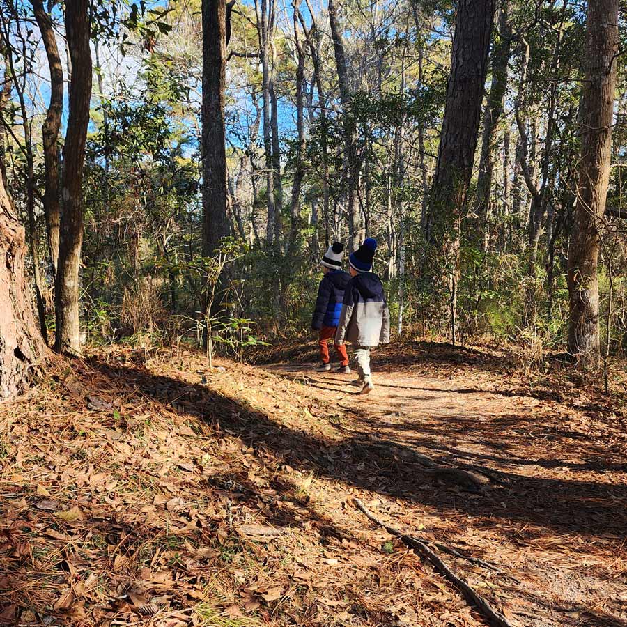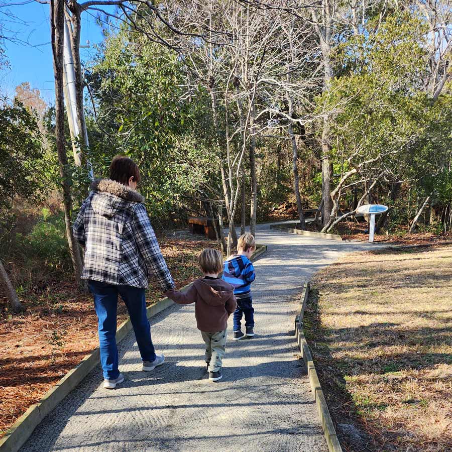 This is definitely the longest and most “hike-y” trail of the group, but if you and your kids are up for it, it’s a great path. You can park at the Nags Head Town Park off of Barnes St. The trail is an out and back trail that’s about a mile and a half total. It runs through the woods, and has a few hills. When you reach the end, the landscape starts to change, and all of a sudden you break out of the woods at the Sound. It’s a really beautiful view, and there’s a bench for a snack break. You definitely feel away from the hustle back there- it’s a nice spot for a reset.